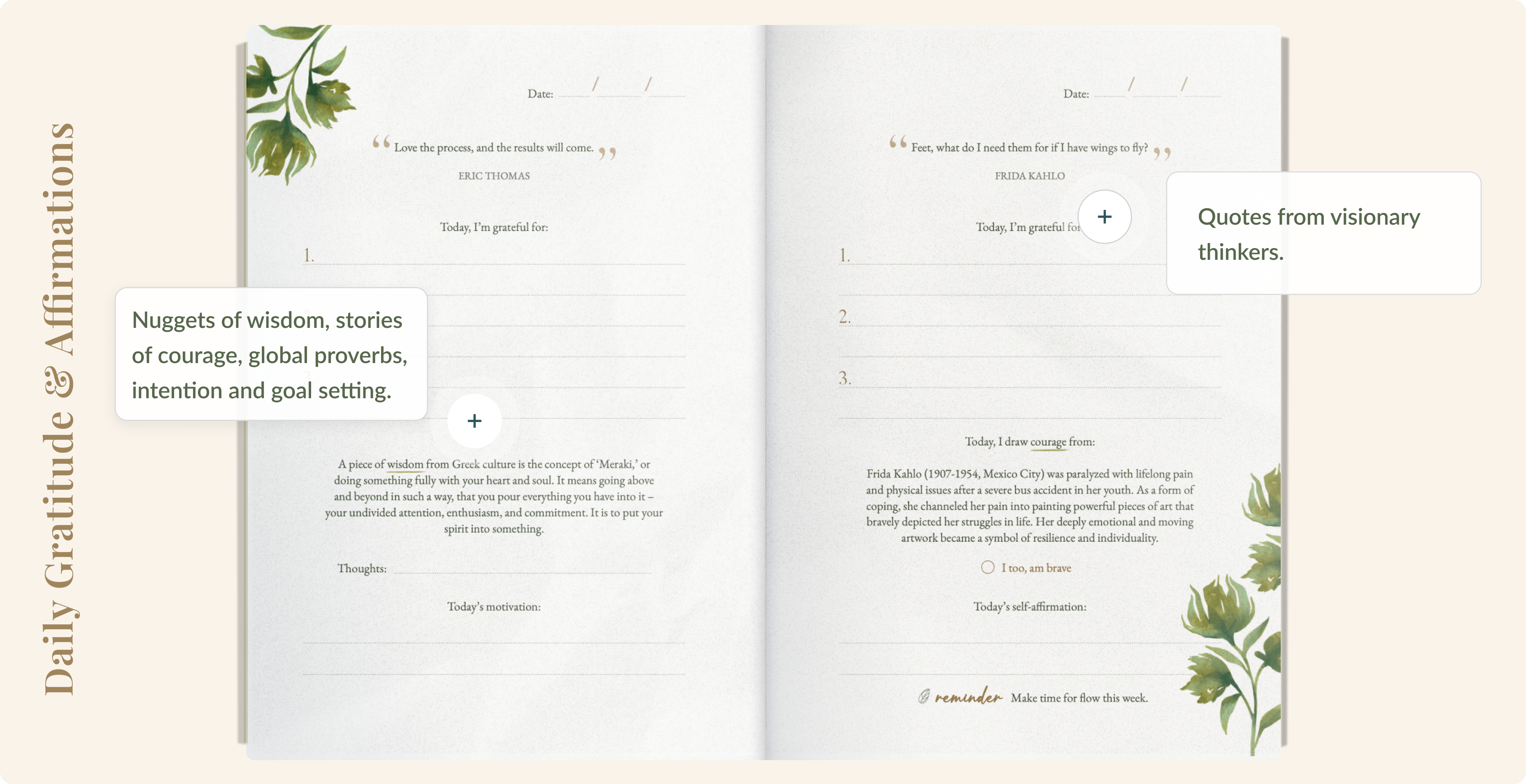 Engage in a daily gratitude and affirmation practice, with deeper reflection prompts to cultivate self-awareness and joy.